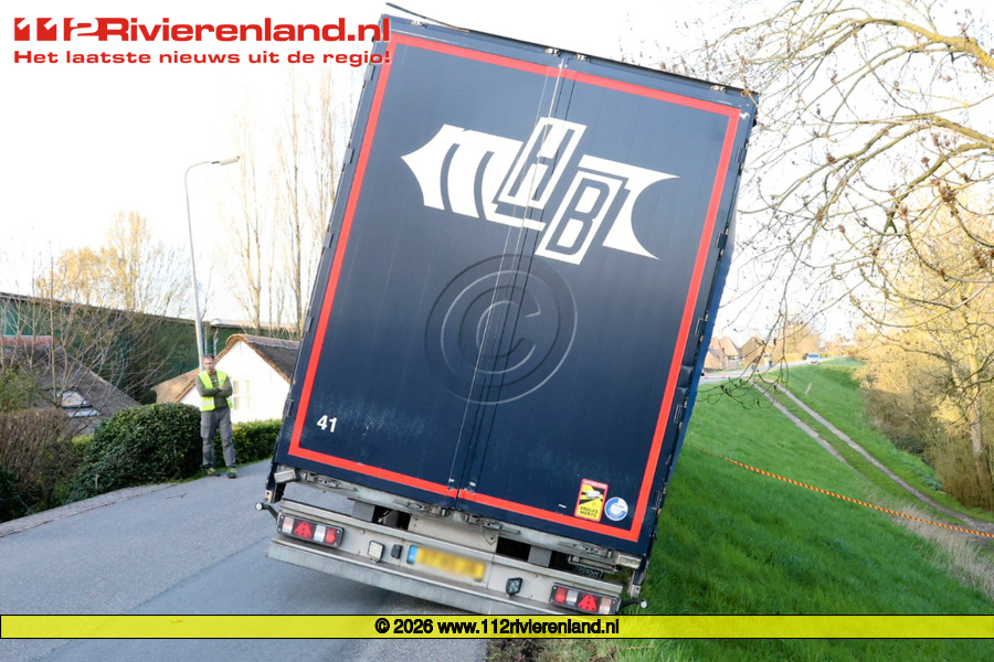 Spijk - Vrachtwagen met aanhanger in de problemen
