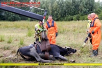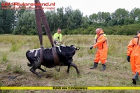Twee vrouwen die aan het wandelen waren in een natuurgebied, zagen dat een koe in de sloot viel. Hij kon er niet meer zelfstandig uit komen en vervolgens werd 112 gebeld. De brandweer kwam met een kraan ter plaatse en heeft het dier veilig op het droge gezet.
