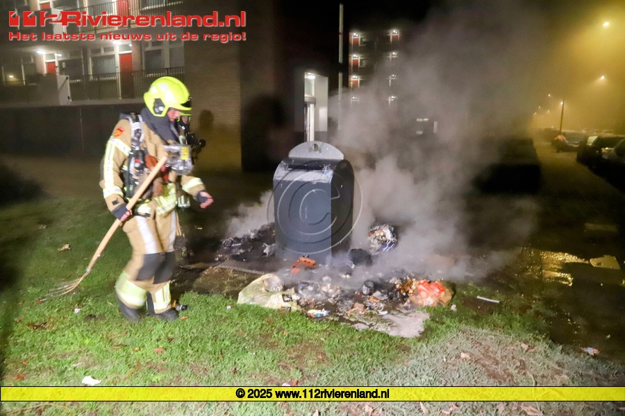 Aan het eind van de straat bij de achterste flat bleek een hoeveelheid afval naast de ondergrondse container in brand te staan. Ook de ondergrondse container stond inmiddels zelf in brand.