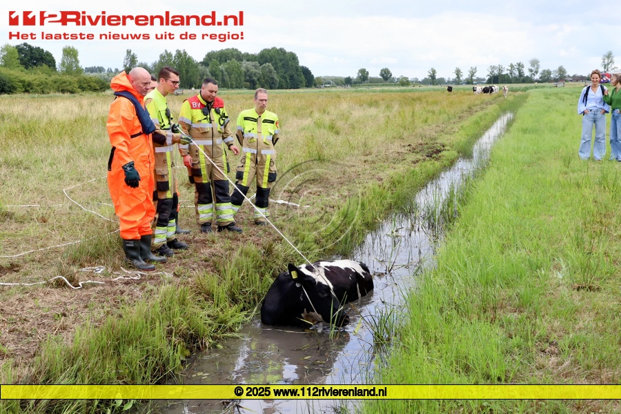 Twee vrouwen die aan het wandelen waren in een natuurgebied, zagen dat een koe in de sloot viel. Hij kon er niet meer zelfstandig uit komen en vervolgens werd 112 gebeld. De brandweer kwam met een kraan ter plaatse en heeft het dier veilig op het droge gezet.