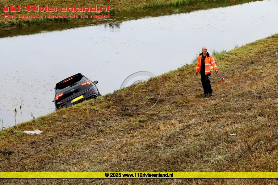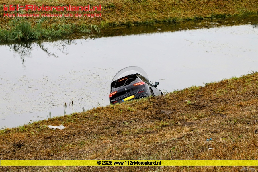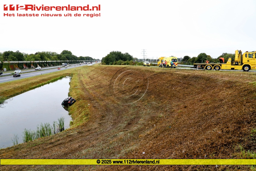 Dinsdag om 13.50 uur werden de hulpdiensten opgeroepen voor een auto te water langs de toerit van de A15 richting Rotterdam bij de afslag Tiel.
