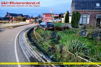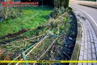 Hij eindigde net na de rotonde in de voortuin van een woning. Hierbij werd een hekwerk omver gereden. Hierbij kwamen de airbags uit.