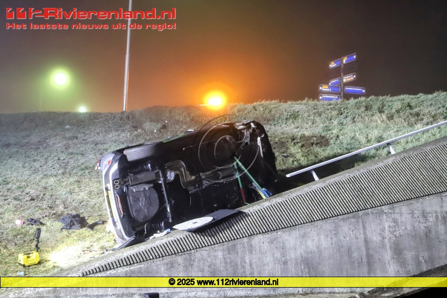 De personenauto kwam op de zijkant onderaan het talud tot stilstand. De brandweer heeft een persoon die achterin zat uit de auto moeten bevrijden. Het slachtoffer is overgebracht naar het Radboud ziekenhuis in Nijmegen. De andere drie andere personen zijn nagekeken in de ambulance. In totaal werden er drie ambulances opgeroepen naast de brandweer en drie politievoertuigen.