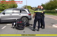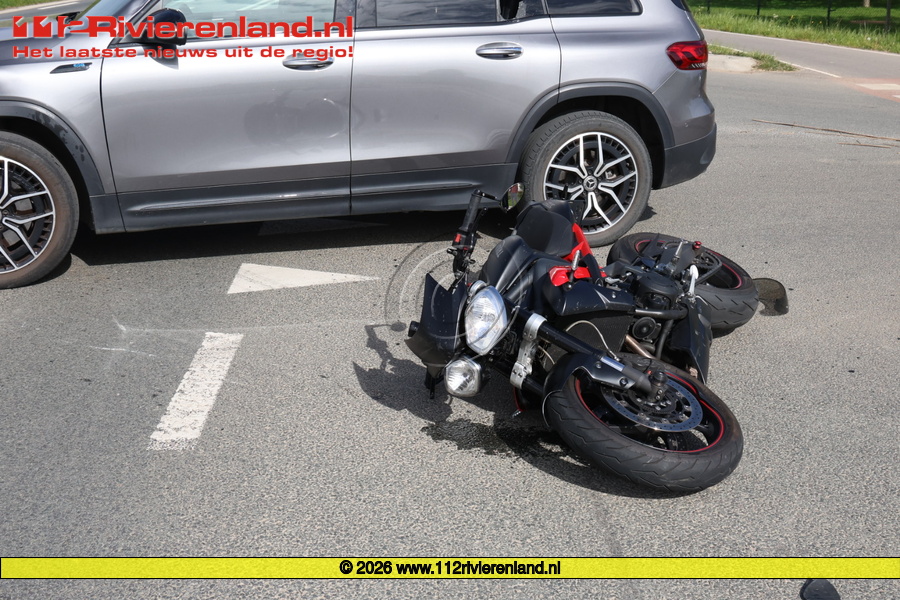 De motorrijder kwam ten val en is met de ambulance overgebracht naar het ziekenhuis. De auto liep een kapotte zijruit op en een deuk in de flank.