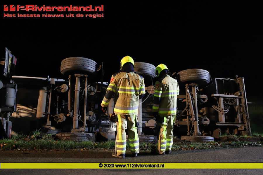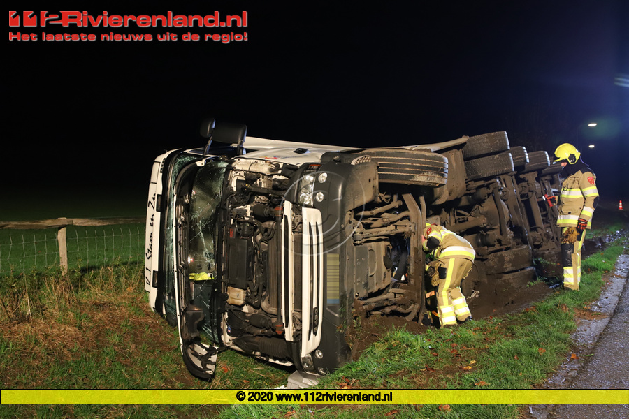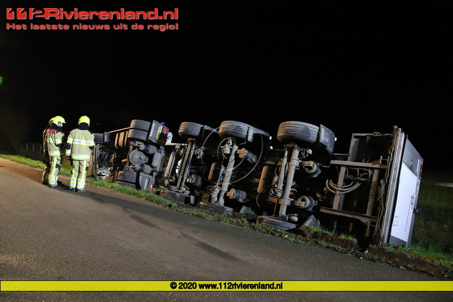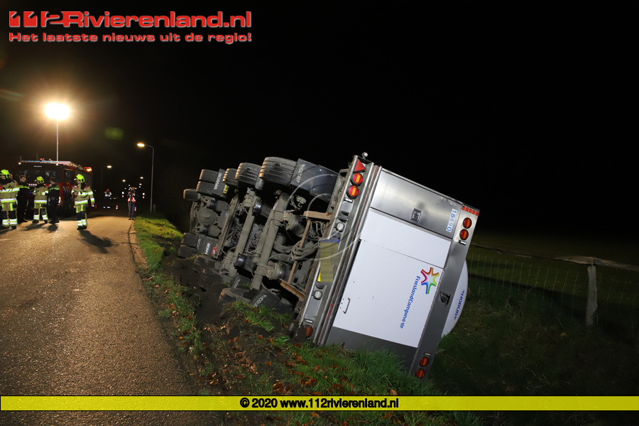 Lienden - Vrachtwagen geladen met 30 ton melk op zijn zijkant in de sloot