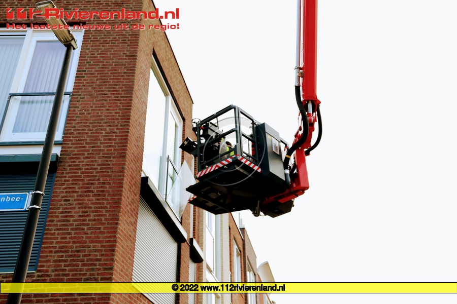 Tiel - Glasplaat hangt gevaarlijk los, brandweer bied hulp