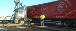 Zaltbommel - Lange files, vrachtwagen door de midden vangrail