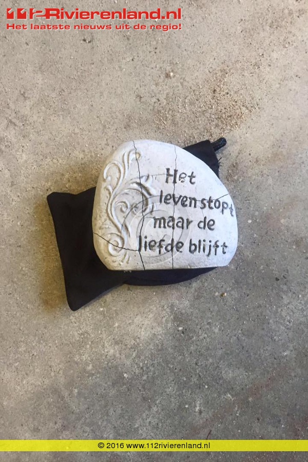 De politie is op zoek naar degene die de volgende grafstenen mist van een graf van zijn/haar dierbare(n). Agenten hebben een verdachte aangehouden met de volgende goederen in zijn auto (zie de foto's). Mogelijk komen de stenen vanaf de begraafplaats aan de Papesteeg te Tiel.
