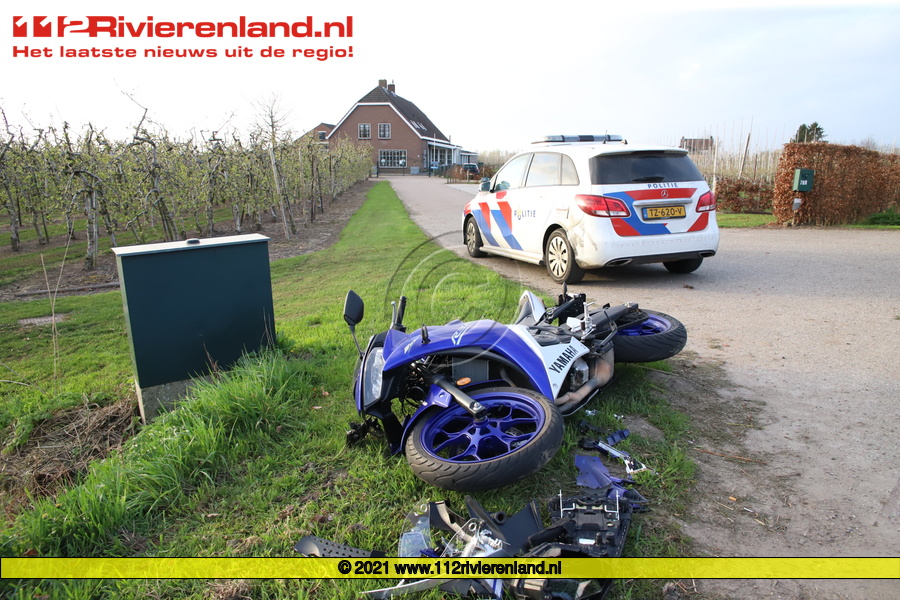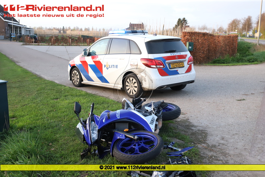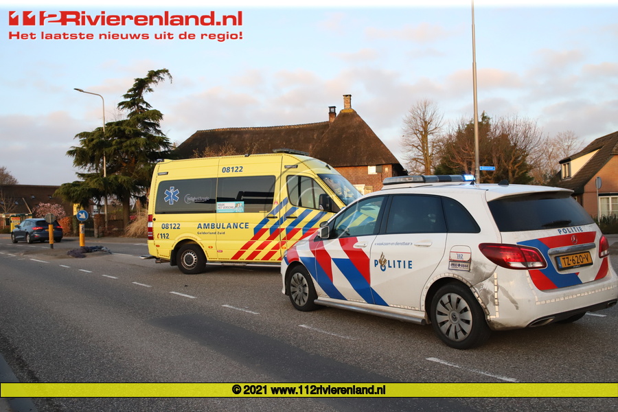 Een motorrijder die kwam uit de richting van Geldermalsen werd geraakt door een bedrijfsbus die vanuit de Dorpsstraat kwam. De man klapte tegen een verkeerbord en raakte hierbij gewond.