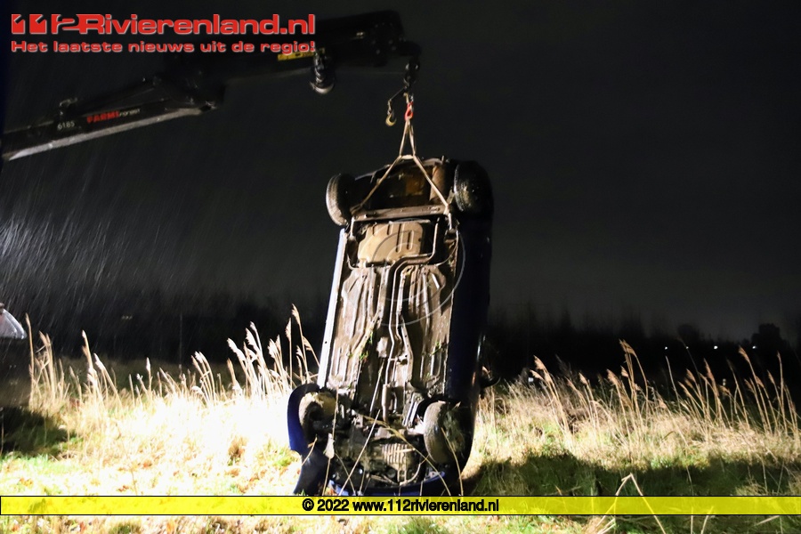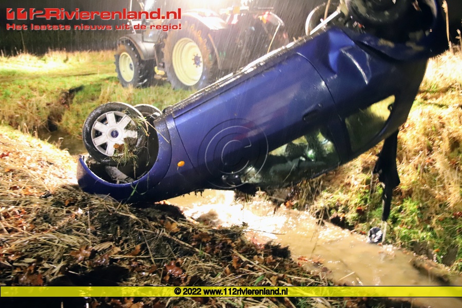Vrijdag om 22.55 uur werd de brandweer opgeroepen voor een auto te water aan de Hamsestraat in Kesteren Een bestuurder van een personenauto verloor de macht over het stuur in een bocht en belandde met het voertuig op de kop in de sloot.