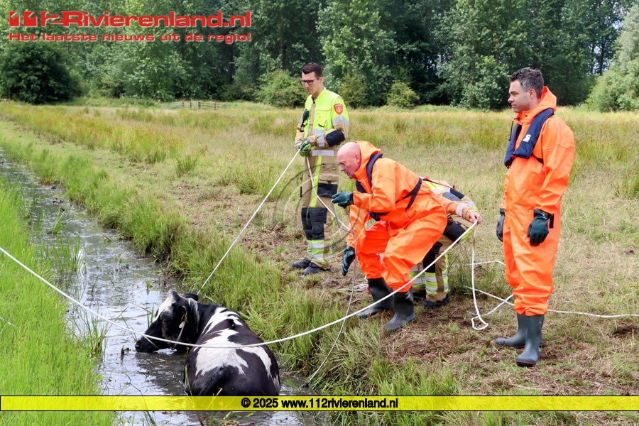 Twee vrouwen die aan het wandelen waren in een natuurgebied, zagen dat een koe in de sloot viel. Hij kon er niet meer zelfstandig uit komen en vervolgens werd 112 gebeld. De brandweer kwam met een kraan ter plaatse en heeft het dier veilig op het droge gezet.