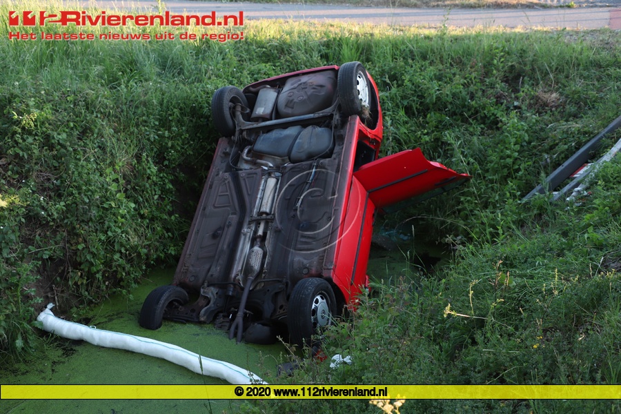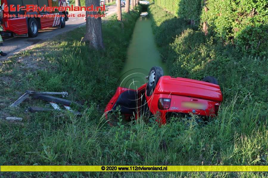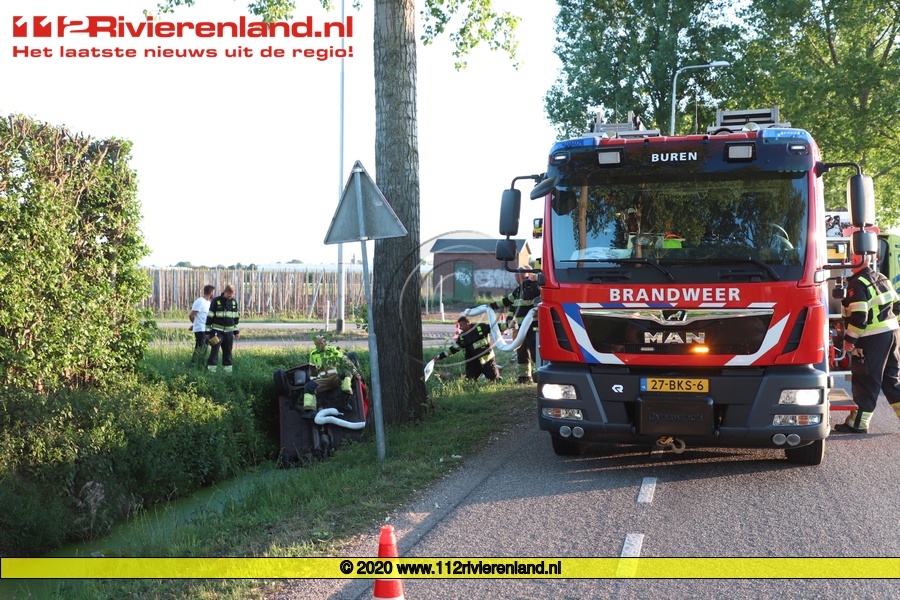 De auto kwam op de kop in de sloot terecht en de vrouw is met de ambulance overgebracht naar het ziekenhuis in Tiel.
