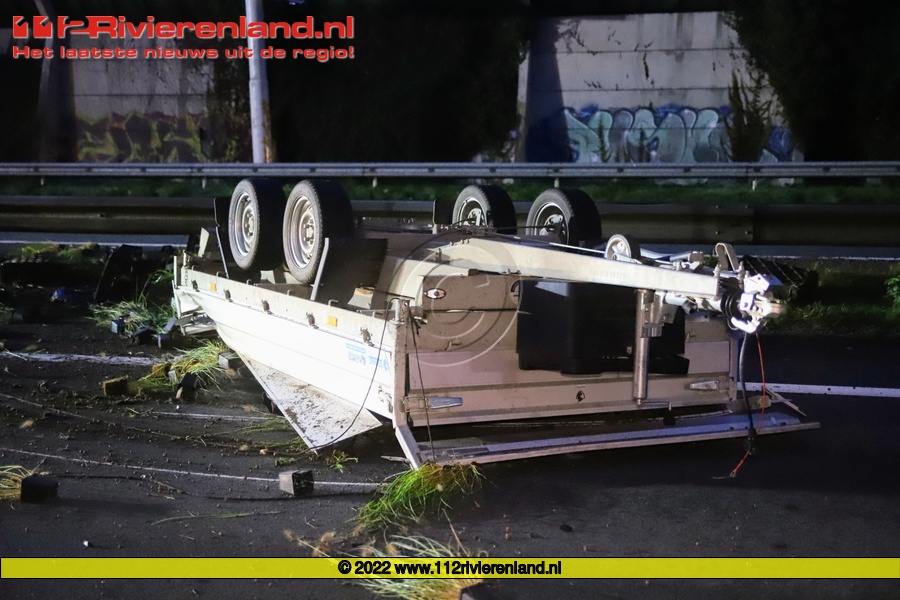 Deze kwam op de kop tot stilstand in de middenberm. De aanhanger was geladen met potten siergras. De brandweer kwam ter plaatse voor assistentie en heeft meegeholpen met de opruimwerkzaamheden