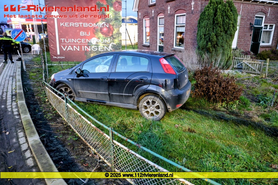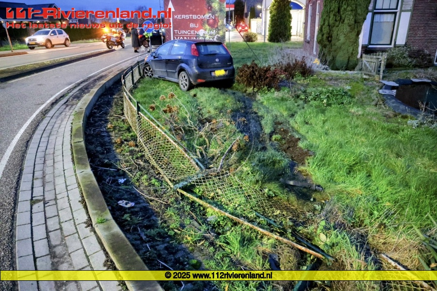 Hij eindigde net na de rotonde in de voortuin van een woning. Hierbij werd een hekwerk omver gereden. Hierbij kwamen de airbags uit.