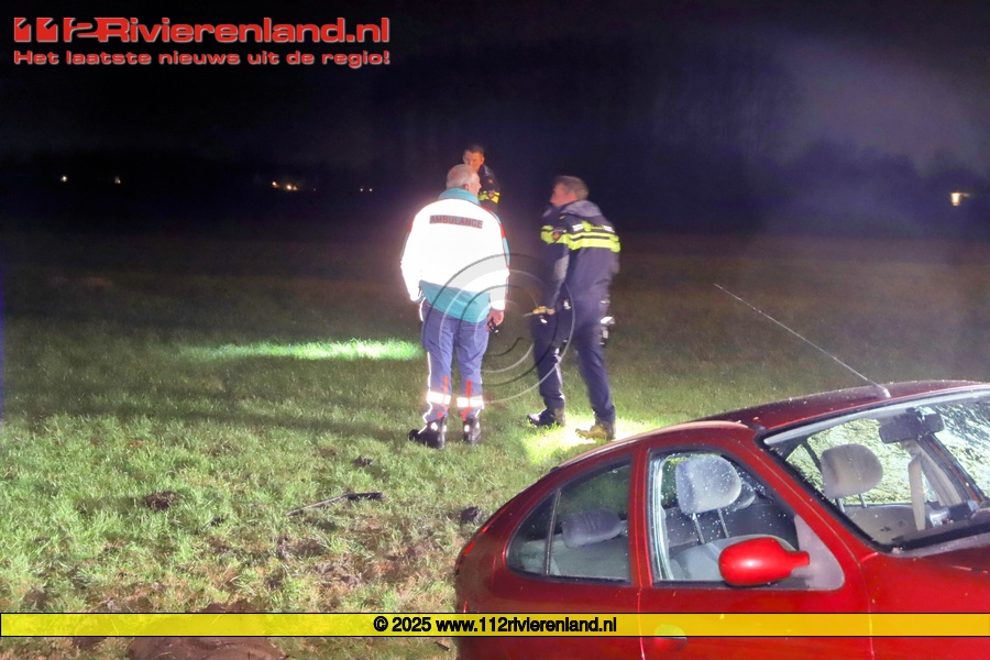 Bij aankomst bleek er een voertuig dwars over de sloot te staan. De personenauto was eerst al de sloot over geraakt en vervolgens via de kant weer teruggeschoten. De twee inzittenden probeerden na het uitstappen nog vuurwerk uit de kofferbak te halen en te verstoppen in het weiland.