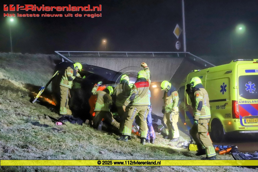 De personenauto kwam op de zijkant onderaan het talud tot stilstand. De brandweer heeft een persoon die achterin zat uit de auto moeten bevrijden. Het slachtoffer is overgebracht naar het Radboud ziekenhuis in Nijmegen. De andere drie andere personen zijn nagekeken in de ambulance. In totaal werden er drie ambulances opgeroepen naast de brandweer en drie politievoertuigen.