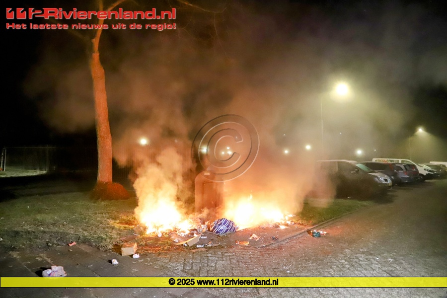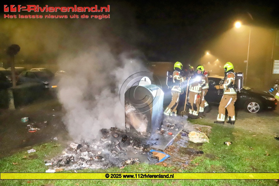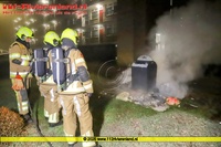 Aan het eind van de straat bij de achterste flat bleek een hoeveelheid afval naast de ondergrondse container in brand te staan. Ook de ondergrondse container stond inmiddels zelf in brand.