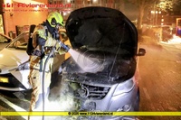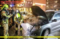 Bij aankomst kwam er rook onder de motorkap vandaan van een auto die stond op een parkeerplaats.