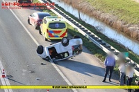 Hierbij kwamen twee personenauto's met elkaar in botsing en één voertuig kwam op de kop terecht. Niemand hoefde mee naar het ziekenhuis.